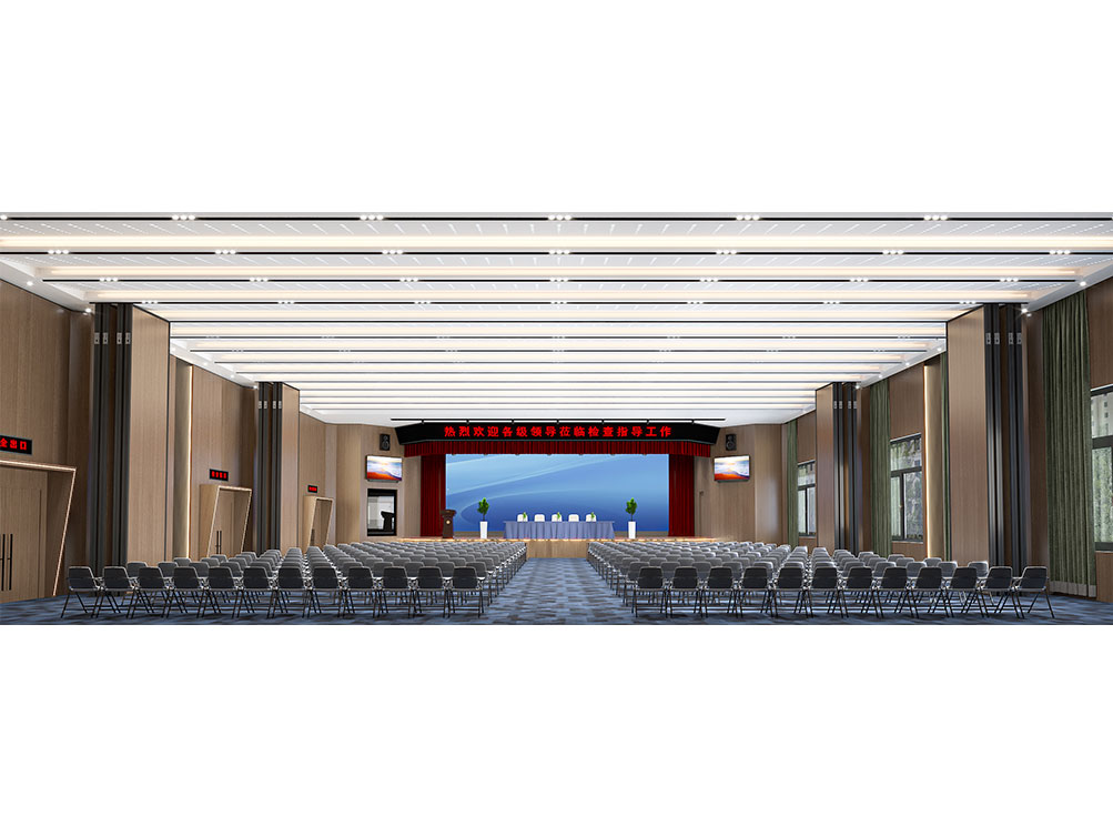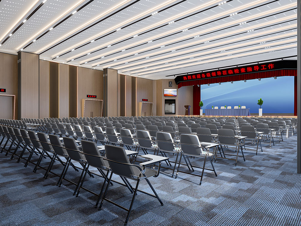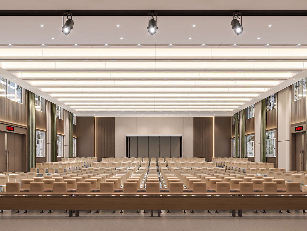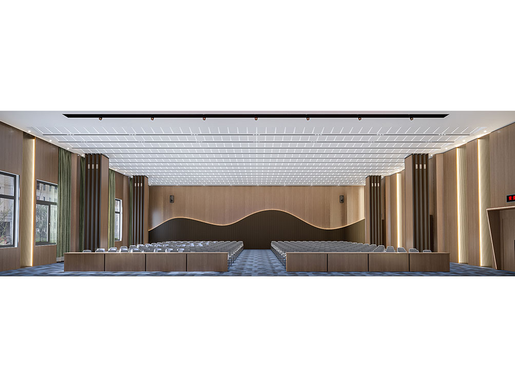 設(shè)計理念: 作為濟南辦公室裝修中大型功能空間的代表,該大堂報告廳以沉穩(wěn)木飾面 + 金屬線條鋪陳基調(diào),頂部穿孔吊頂搭配嵌入式燈光,兼顧聲學與視覺通透感。巨幅電子屏 + 對稱音響設(shè)備適配會議、匯報需求,米色座椅與紅色臺階營造莊重又舒適的氛圍,是濟南辦公室裝修中高規(guī)格功能空間的典型設(shè)計。